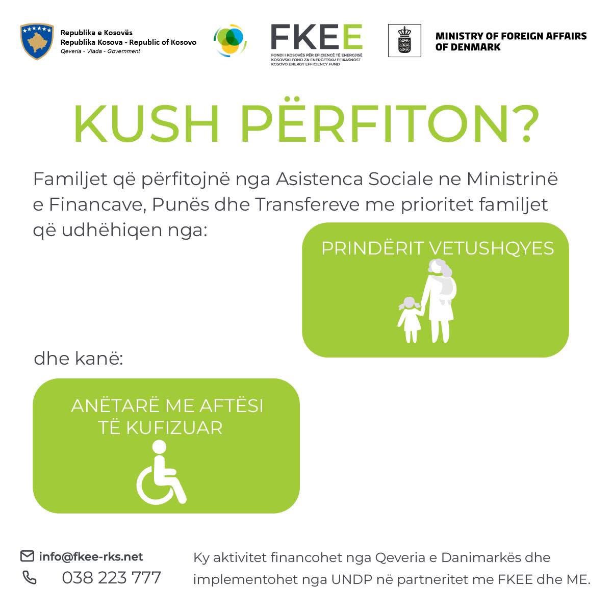 Prishtinë, 01.10.2025- 200 familje në nevojë do të përfitojnë nga masa për izolimin e shtëpisë dhe masa të tjera të efiçiencës deri në vitin 2027 falë projektit “Rruga gjithëpërfshirëse dhe e drejtë drejt vitit 2030: E ardhmja e energjisë së gjelbër”, në kuadër të marrëveshjes në mes Qeverisë së Republikës së Kosovës dhe Qeverisë së Danimarkës për përkrahje në fushën e energjisë, që do të zbatohet nga UNDP në partneritet me Fondin e Kosovёs pёr Efiçiencё tё Energjisё dhe Ministrisë së Ekonomisë.