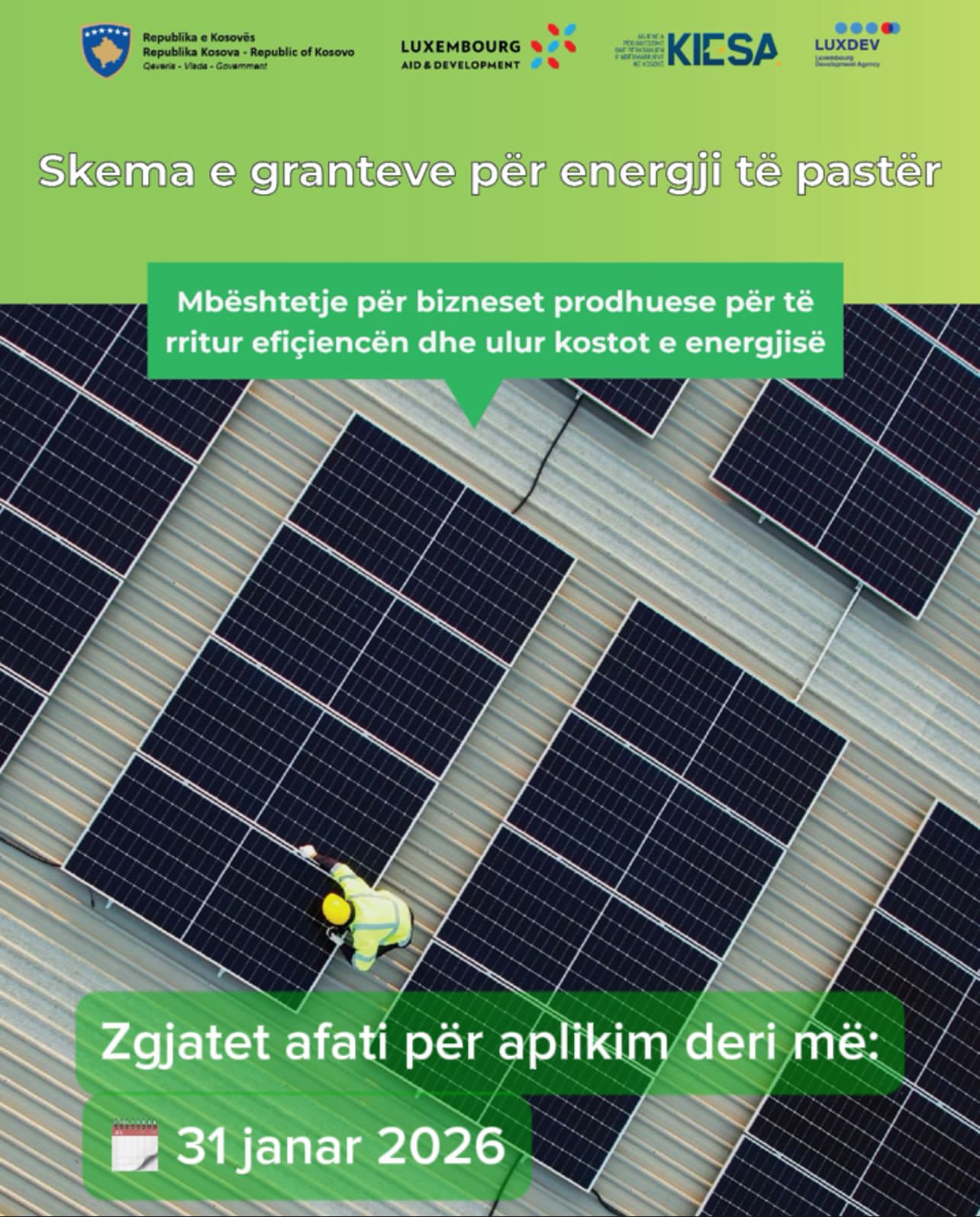 Ministria e Ekonomisë njofton se Thirrja Publike për Skemën e Granteve për Energji të Pastër është e hapur deri më 31 janar, andaj ju ftojmë që të aplikoni sa më parë